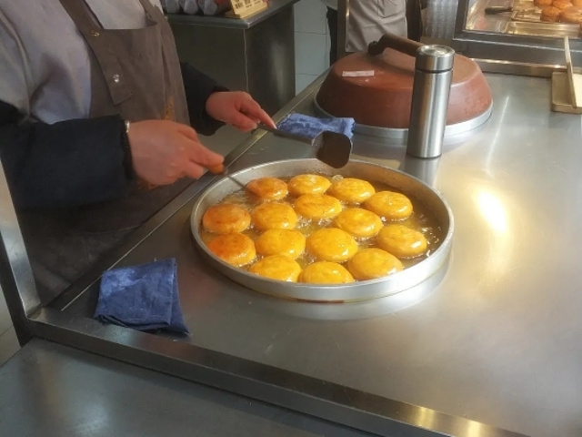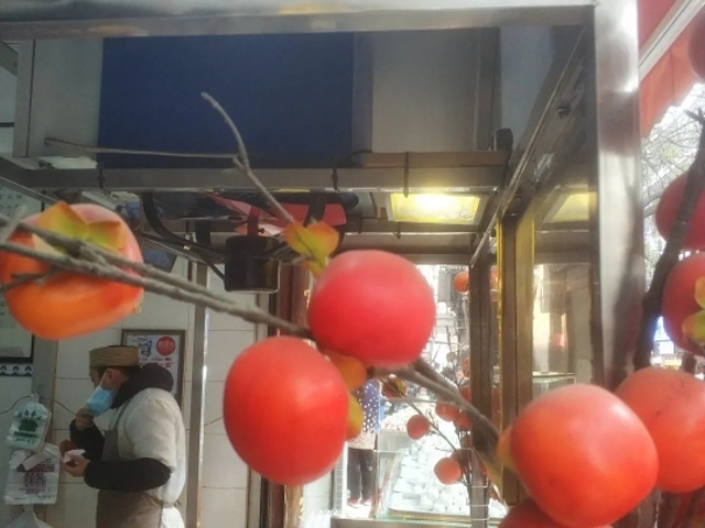 吃完饭正溜达呢,无意中看见店里的店员小姐姐在翻动这个柿子饼,金黄的色泽特别诱人,柿子饼三块钱一个,价钱适中,就和朋友买了两个尝了一下,味道还可以,香软可口就是有点烫嘴,他们家除了石子饼,还有元宵,但是吃太饱就没有去尝