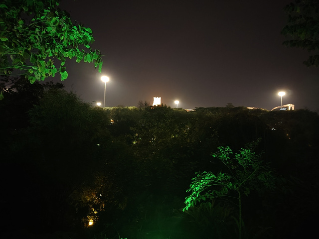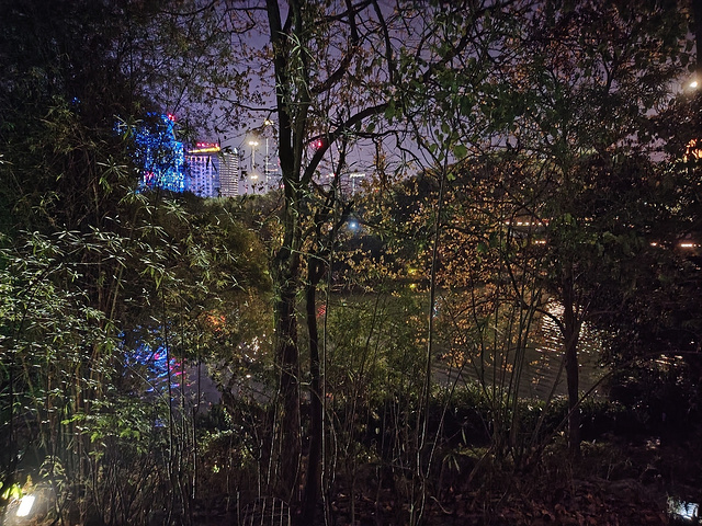 夜晚的竹林小径,幽静而清新,我独自一人,享受这份宁静。 这里是过了南宁民族大道竹排冲上的桥,右拐,广西高院旁边的小路,这条路就在竹排冲边,我从来没走过,百度地图也没显示叫什么路。 这晚没事,就沿着小路往里面走,这里树林茂密,纵深很远,透过树林,可以看到竹排冲和远处的会展中心的“朱瑾花”雕塑。