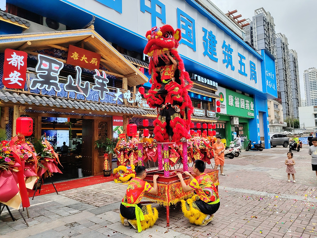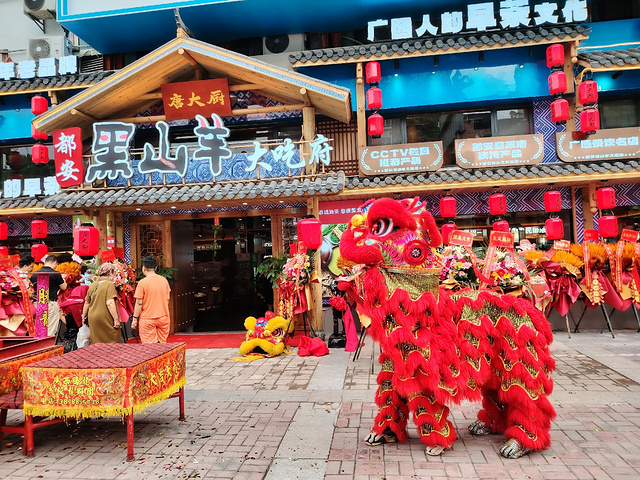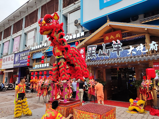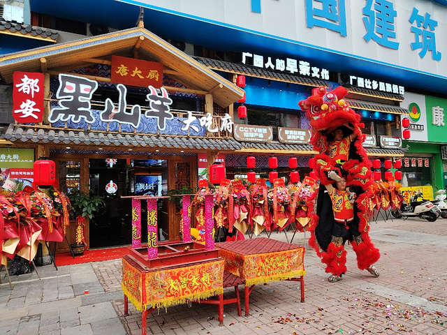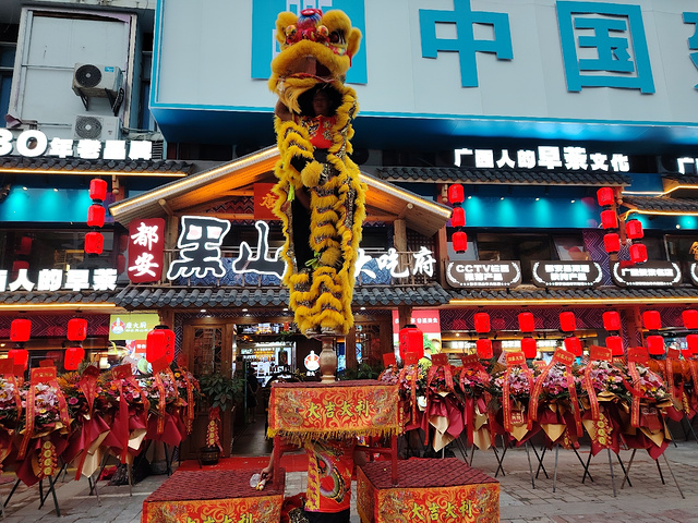 在南宁亭洪路,好多人在看醒狮表演,原来是唐大厨都安黑山羊大吃府开业请来的醒狮队,这狮子的飞跃腾挪都很厉害的。