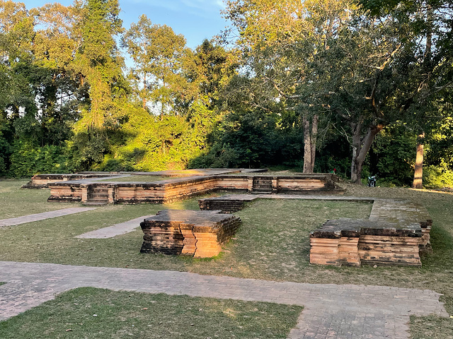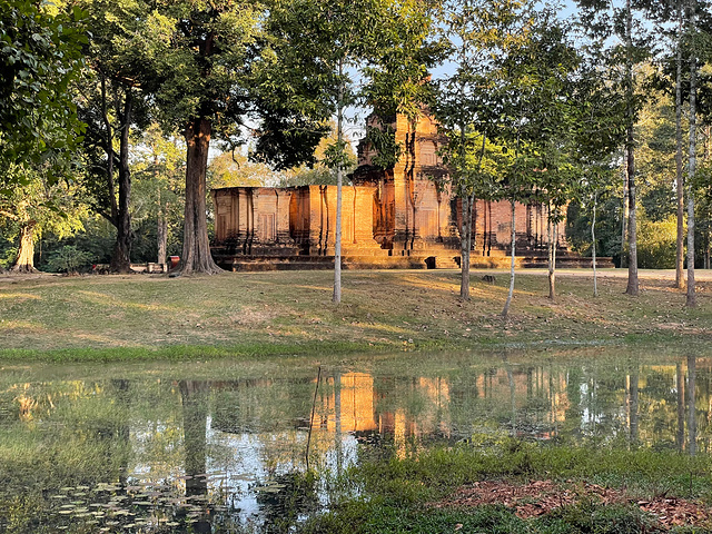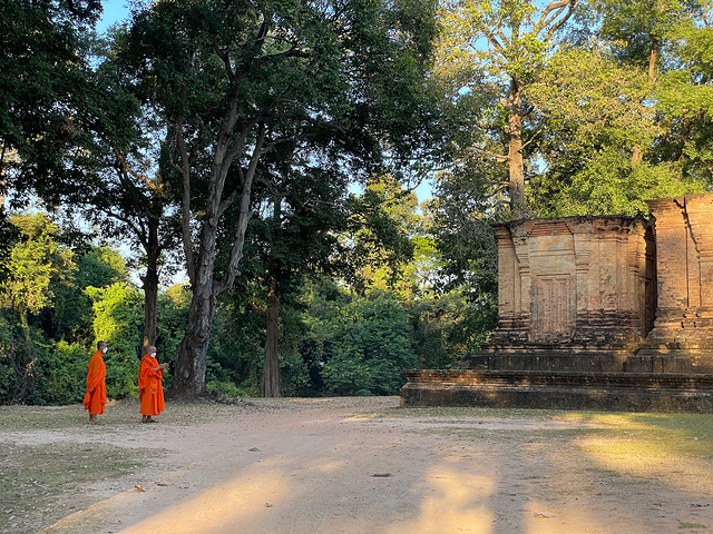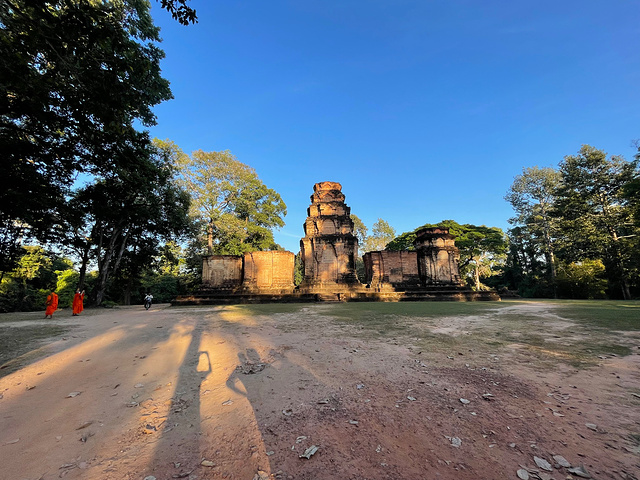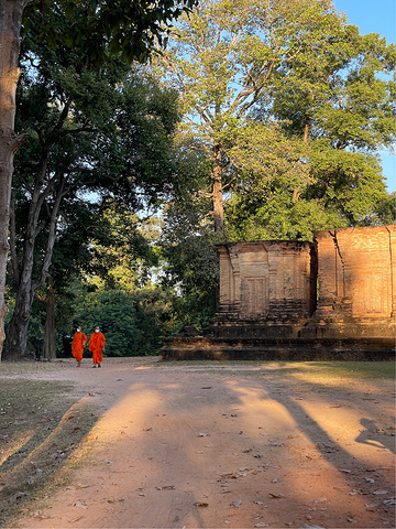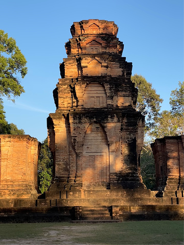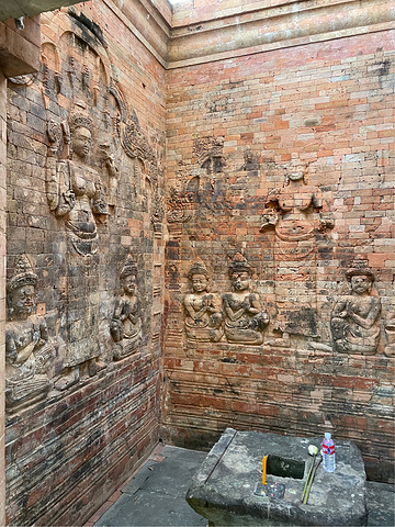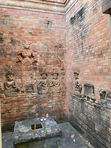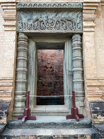 【豆蔻寺】 Prasat Kravan 豆蔻寺建于921年,19世纪由 法国 人重建。就感觉是一字排开五座塔而已,后面才知道这个寺却有吴哥地区仅有的砖雕神像,主塔壁上的浮雕,描绘的是 印度 神话中毗湿奴骑大鹏金翅鸟,西塔壁上浮雕描绘毗湿奴的神妃吉祥天。