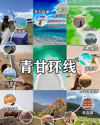 西北定制游人均2k+路线可选青甘大环线一直是一条令人心驰神往的旅游线,它融合了青海和甘肃两地的自然风光和人文景观。 旅行计划~ 必玩经典景点: ①察尔汗盐湖:如果治愈有颜色,那一定是察尔汗绿 ②翡翠湖:湖水倒映着蓝天白云仿佛落入天空之境 ③青海湖:一半金黄油菜花海一半梦幻蓝湖,是青海名片 ④茶卡盐湖:网红热门天空之境,要做小火车哦 ⑤鸣沙山月牙泉:大漠奇迹,古丝绸之路上的明珠 ⑥莫高窟:东方丝路文明中史诗级博物馆,浓油重彩的敦煌壁画穿越千年时光 ⑦七彩丹霞:国内唯一的丹霞地貌与彩色丘陵景观复合区 ⑧U型公路:神秘的315公路,中国的66号公路 行程安排: D1:各地一西宁 D2:西宁一青海湖黑马河景区---茶卡盐湖一茶卡 D3:茶卡一U型公路一翡翠湖-一大柴旦 D4:大柴旦一察尔汗盐湖-水上雅丹 D5:水上雅丹-敦煌莫高窟一鸣沙山月牙泉 D6:敦煌一嘉峪关一七彩丹霞一张掖 D7:张掖一祁连大草原一西宁 ☑这条线路,涵盖大西北超火IP:敦煌摩洛哥式沙漠帐篷酒店十网红公路十网红四湖 ☑8天时间,将西北大环线精华景点一网打尽☑去一次,相当于去了10次!山川、湖泊、草原、沙漠、戈壁,各种景观都能看个遍 △Tips:如果你是第一次去大西北,真心不建议自驾游,大西北的路线很复杂,很容易迷路 单独包车也很贵