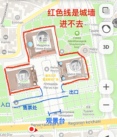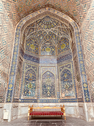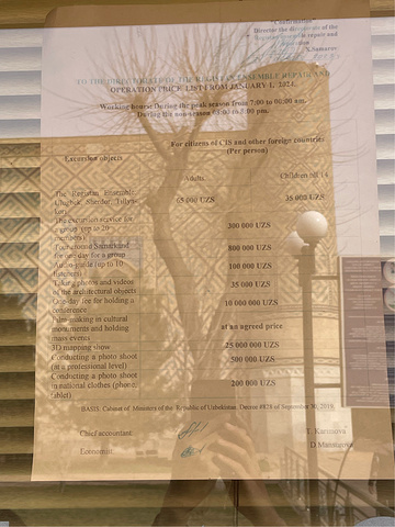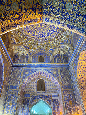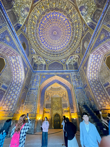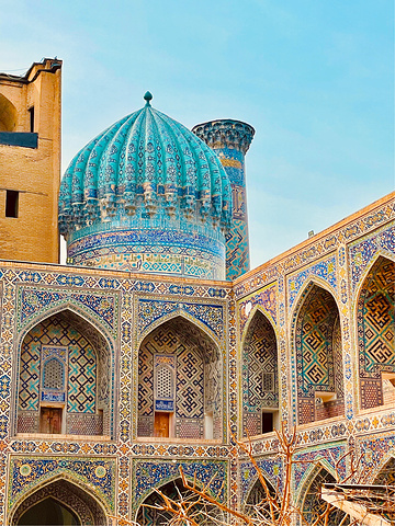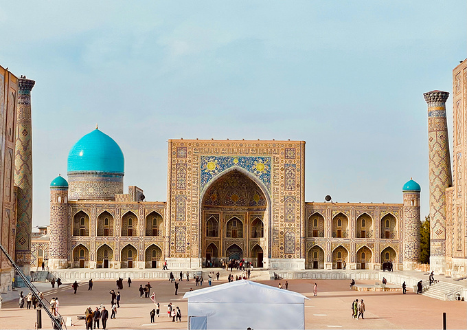 撒马尔罕【雷吉斯坦广场】 Registan 雷吉斯坦广场是帖木儿帝国国都撒马尔罕的中心。“雷吉斯坦”一词在波斯语中意指“多沙的地方”或是“沙漠”。雷吉斯坦广场是个城市广场,首都人民会聚集在这里听取皇告,乃至围观罪犯公开处刑。几个世纪以来,雷吉斯坦广场上的建物遭到严重破坏,并在前苏联时期透过修复及重建以恢复到原先状态。 雷吉斯坦广场和三个伊斯兰学校建筑。从左到右:乌鲁伯格经学院、提拉-高利经学院和舒尔-多尔经学院。 门票:6w5索姆(39元) 时间:8:00-20:00