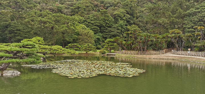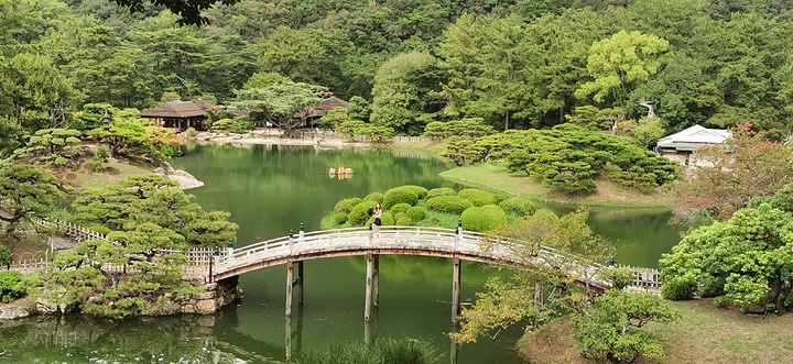 栗林公园(Ritsurin Garden)是日本香川县高松市南郊的国宝级回游式庭园,园林设计 :以紫云山为背景,通过6个池塘、13座假山与松树修剪艺术,形成“一步一景”的层次感。南湖中心的偃月桥与倒影构成圆形禅意景观,掬月亭茶室可体验传统茶道。 四季风貌:春季樱花、夏季绿荫、秋季红叶、冬季雪景,1400棵松树经匠人修剪,呈现盆栽般的雅致形态。