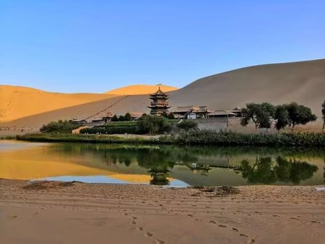 鸣沙山游记:聆听大漠的低语,触摸千年的回响 这座屹立于丝绸古道上的金色沙海,不仅以“沙岭晴鸣”的奇观闻名于世,更承载着千年丝路的沧桑与浪漫。当我真正置身于这片苍茫大漠之中,才明白什么是“大漠孤烟直,长河落日圆”的壮美与苍凉。 清晨六点,我们便抵达了景区。此时太阳刚刚跃出地平线,金色的阳光洒在连绵起伏的沙丘上,整座鸣沙山仿佛披上了一层金纱。沙粒在晨风中轻轻流动,发出细微的“沙沙”声,宛如大自然的低语。导游说,这便是“鸣沙”之名的由来——当人从沙坡滑下,沙粒摩擦,会发出如鼓角、似丝竹的轰鸣声,回荡在山谷之间,令人震撼。 鸣沙山平均海拔在1200至1700米之间,最高峰达1715米,山体由红、黄、绿、黑、白五色细沙堆叠而成,宛如大自然的调色盘。远望如金字塔耸立,近看则如波浪翻滚,沙脊蜿蜒如龙蛇游走。我们穿上鞋套,踩在松软的沙面上,每走一步都深陷其中,上山“一步退半步”,虽累却充满乐趣。登顶后,极目远眺,沙海无边,天地交融,仿佛自己也成了这幅画卷中的一粒沙。 最令人难忘的,是骑骆驼穿越沙漠的体验。骆驼队排成一线,缓缓向沙山深处进发。随着驼铃叮当,我仿佛穿越回古代商队的岁月。骆驼步伐稳健,虽高耸却异常平稳。坐在驼背上,看沙丘起伏,听风声低吟,心中涌起一种难以言喻的宁静与敬畏。途中,我们还尝试了滑沙——从高高的沙坡一跃而下,沙粒在身下飞溅,耳边是呼啸的风声与沙鸣,刺激又畅快。 下山后,我第一眼便望见了那弯如新月的泉水——月牙泉。它被鸣沙山环抱,千百年来不被黄沙掩埋,清澈见底,宛如沙漠中的一颗绿宝石。泉水旁芦苇摇曳,亭台错落,与背后的黄沙形成鲜明对比,宛如仙境。传说中,月牙泉是党河地下水溢出地表所成,处于两个洪积扇之间的低洼地带,才得以在沙漠中长存不涸。 傍晚时分,夕阳西下,整个鸣沙山被染成金红色。我们坐在沙丘上,欣赏着落日余晖中的驼队剪影,感受着“大漠落日圆”的诗意。夜幕降临后,月牙泉畔还上演了万人星空演唱会与无人机表演。音乐在夜空中回荡,无人机在星空下组成敦煌壁画图案,历史与现代在此刻交融,令人动容。 除了自然奇观,敦煌的美食也令人难忘。夜市上,一碗热气腾腾的羊肉泡馍,配上烤得焦香的羊肉串,再喝一口冰凉的杏皮水,瞬间驱散了沙漠的燥热。手抓羊肉、甜醅子、驴肉黄面……每一道小吃都承载着西北的豪迈与热情。 此次鸣沙山之行,不仅让我领略了大自然的鬼斧神工,更让我感受到敦煌深厚的文化底蕴。鸣沙山与月牙泉,是沙漠与泉水的奇迹共存,是自然与人文的完美交融。它教会我:在荒芜中,也能孕育出生命与诗意。 登鸣沙山,是一次身体的挑战,更是一场心灵的洗礼。如果你也渴望一场远离喧嚣、直面天地的旅行,那就来鸣沙山吧。在这里,听沙鸣,望星空,骑骆驼,滑沙丘