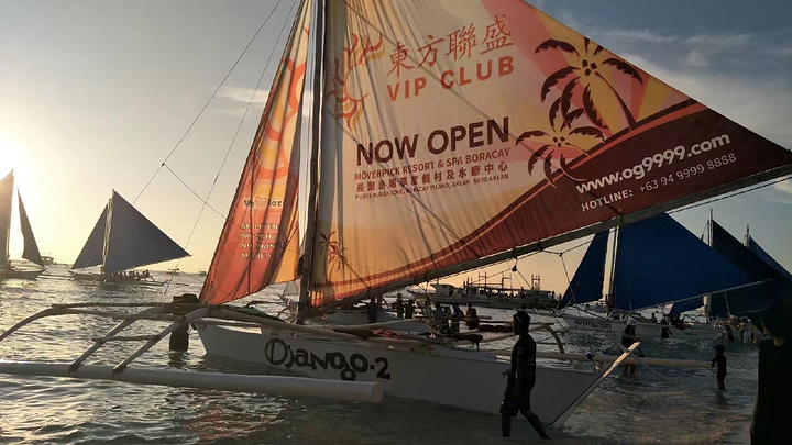 长滩岛落日风帆,其实就是在太阳要落山的时候带你坐帆船出海游。 快到晚上的时候,你在白沙滩上会看见很多小帆,他们会来问你需不需要玩落日风帆?我们是直接在当地随便找了一个小黑预订的,也可以提前在网上预订,价钱是差不多的,35块钱人民币左右,但是玩不了太久,他就是驾驶着帆船,把你开到中心拍几张照片,然后再开回来。全程大概10到20分钟左右吧,快一点的话,可能十分钟就过去了,其实哪怕你不做帆船,你在岸上拍照片,拍日落都是很漂亮的。 因为价钱很便宜,所以我是很推荐大家去体验一下的,体验一下夕阳西下的感觉。 价钱就按照35元人民币来进行,换算超过这个价钱,那都是可以讲价的。