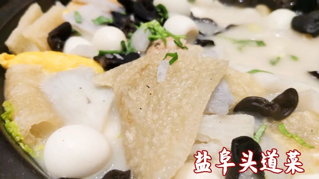 盐阜头道菜,即肉皮杂烩,在苏北有“无膘不成席”的说法。没有什么固定食材的要求,但膘是一定要有,再根据老师傅的经验汤菜参半加入。放上小肉丸、青菜、木耳、鱼丸、鹌鹑蛋等炖成一大锅。汤呈现好看的乳白色,表面浮着一层金黄的油花,可别小看这盘其貌不扬甚至有点土里土气的菜,那汤和其中的膘可是一绝。汤里浓缩着各类荤素的精华,别提多鲜了,用来泡饭都能多吃好几碗,膘也吸满了汤汁,一口吃下去,膘的鲜美和汤的浓厚爽滑交织,“头道菜”名不虚传。