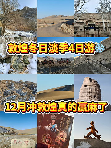 敦煌冬日探秘,遇见千年文化与自然的完美交融❄️🌟 12月的敦煌,宛如一幅绚丽的画卷,别具一番魅力。淡季的光线透过白雪的覆盖,童话般的宁静与温暖不仅让我逃离了冬日的寒冷,也让我体验到了这里独特的人文景观。四天的悠闲旅行中,我彻底沉浸在这片神秘的土地上,让我倍感充实与快乐! Day 1: 包车探戈,戈壁与古迹 第一天,我们选择租车出发,沿着那条如诗如画的戈壁公路,随时停下来拍摄那些壮丽的风景,仿佛自己也是大地的孩子。我们的第一站是榆林窟,洞窟中壁画的色彩和雕塑的细腻让人艳羡,尤其是水月观音和唐代壁画,色彩斑斓而生动,令人心醉。最后,在锁阳城遗址,感受大漠的沧桑,让这份孤寂在心中久久回荡。 Day 2: 莫高窟的艺术殿堂 第二天,浸泡在莫高窟的艺术世界里,真是一种洗礼。淡季的我们,意外地享受了10个普窟与4个额外洞窟的深度游。96窟的大佛令我惊叹,而328窟的雕塑之美,细致得几乎让人窒息,仿佛触碰到了历史的脉搏。晚上,我们在雪中观看《乐动敦煌》,尽管有些遗憾无法看到《又见敦煌》,但那一夜的灯光与音乐,依旧让我回味无穷。 Day 3: 鸣沙山的悠闲与夜市的乐趣 早晨,我们来到鸣沙山,白雪与沙漠相映成趣,简直是个拍照天堂,心里的快乐无法用言语表达!傍晚时分,我们游览敦煌夜市,虽然因维修人少清净,但挑选伴手礼时的从容,让我的心情格外愉悦。用10元就能买到彩色的冰箱贴,简直是完美的旅行记忆。 Day 4: 悬泉置的冷门宝藏与文化收尾 最后一天,我们搭乘公交前往刚刚开放的悬泉置,寂静的小路上,只有我们两人,历史的回响让人感受到一丝敬畏。接着,我又去了敦煌博物馆,在这里,一幅幅经典的壁画与之前见过的遗迹形成了有趣的联系。那小山丘,摇曳着魏晋气息,让我瞬间穿越了千年。 这个冬季,敦煌以其安静与魅力,让我在匆忙的生活中重新找回了自我。这里不仅是沙漠与雪景交织的浪漫,更是千年文化的珍贵底蕴。尽管有小遗憾,却无损我的喜悦,敦煌真的是冬天旅游的理想之地!❄️🌟