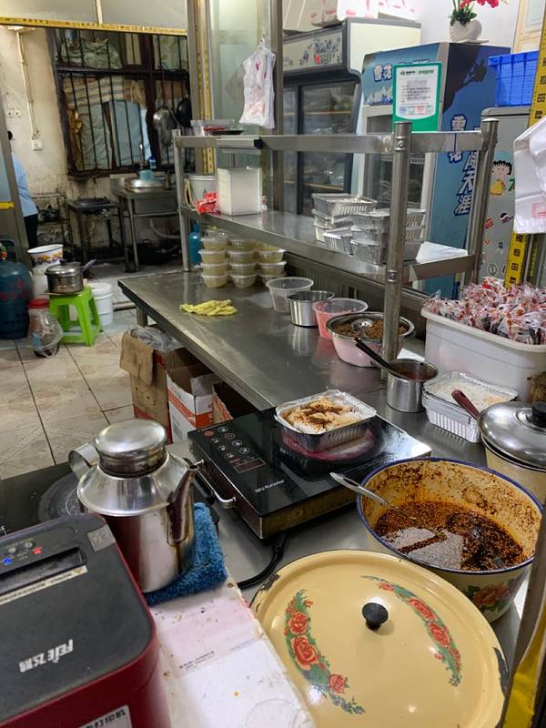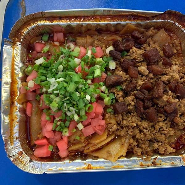 一家以外卖为主的门店,烤粉是招牌。这家店深藏在贵定步行街旁的金丰小区内,门面不小,但是少有顾客堂食,倒是外卖小哥取餐频繁。 他家主打的是烤粉、烤米皮、烤米豆腐,烤土豆粉。用锡箔纸盒放在电磁炉上制作,比较特别。烤米皮14元一份,点餐后等待5分钟即好,份量还挺足的,里面有大量肉末和小脆哨、酸萝卜丁等等。他家还有免费的绿豆汤赠送(虽然份量比较少,但是略胜于无)。 米皮本身品质很优秀,米香味十足,只是烤制后一夹就碎,不太方便用筷子吃,反而是配合勺子更加方便入口。总体口味偏咸,但是烤制的香味很棒,把肉末的香味,油辣椒的香味很好地融合起来了。唯一不足的就是油辣椒里放的味精过多,烤熟了还不觉得,要是直接添加冷的油辣椒,还能吃出味精颗粒,这点需要改进。