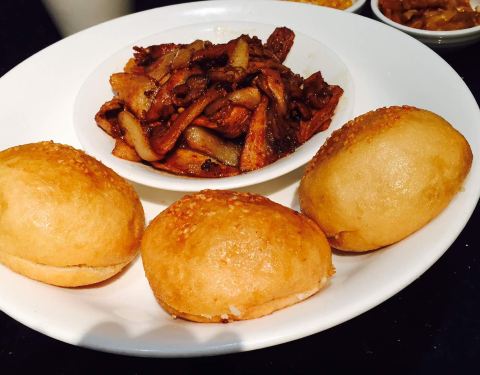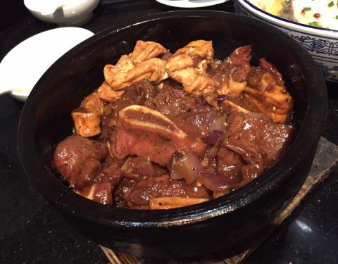 面皮揭不开都是粘在一起 我们三个人本来点五个菜一个凉菜一个汤三个肉菜菜 服务员还说我们不够吃 我们多加了一个后来吃不完浪费了,呵呵