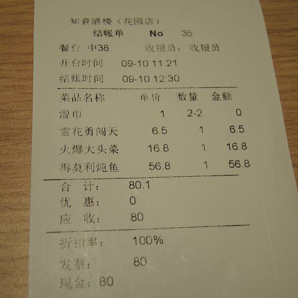 看来是家老店,顾客蛮多,晚上八点多到店,很多菜都没了,米饭也没了,点了铁板茄子、得莫利鱼、干锅土豆片和手撕饼,服务员扭脸就漏了手撕饼,后来发现了要求服务员补上,问有什么啤酒,另一个服务员介绍有纯生和醇厚,问都是哈啤的吗?回答是,拿瓶纯生吧,服务员等会儿拿瓶啤酒过来砰的打开,到手一看是雪花啤酒。喝吧。几道菜分量大味道都行,都偏咸。整体上透出味儿,就是服务很热情,但不够细致。服务员和你对话就像邻居们每天见面都打招呼,但那是生活而不是工作。小湿巾收费不太好。