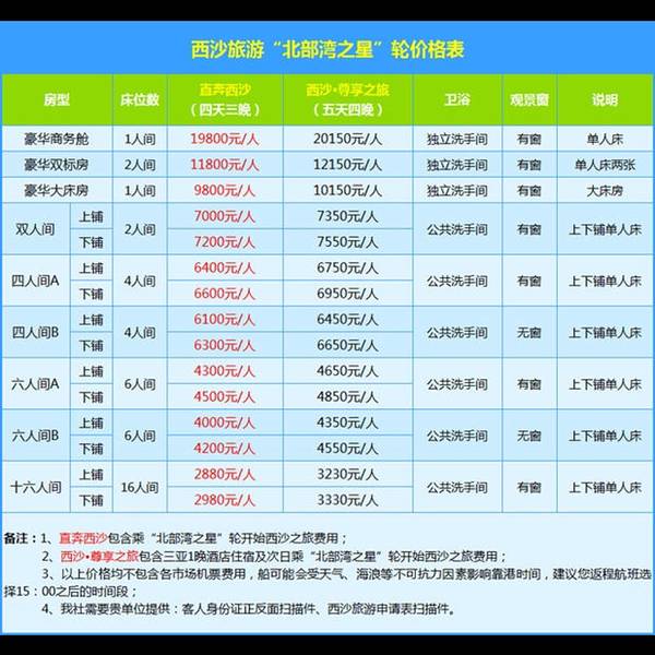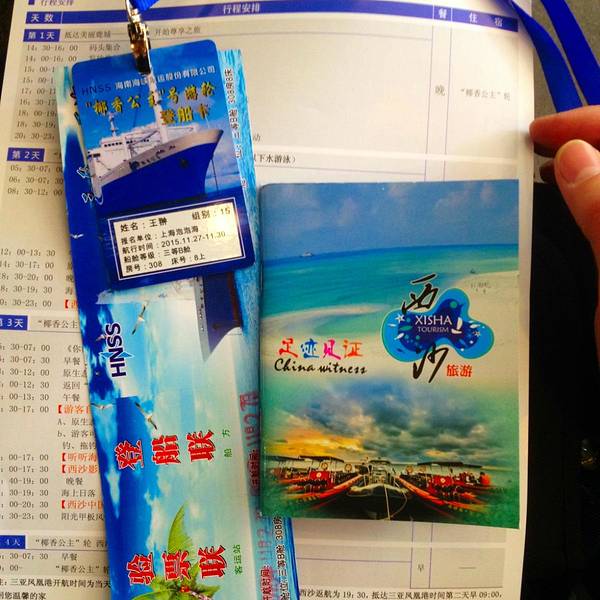 下午2点,在三亚凤凰岛国际邮轮码头集合,发登船卡(登船卡一定要保管好,这相当于你在岛上的身份证明,行程结束后会回收),讲讲西沙概况啥的。下午4点半正式登船起航,接下来就可以随意在船上走走拍拍,去甲板...下午2点,在三亚凤凰岛国际邮轮码头集合,发登船卡(登船卡一定要保管好,这相当于你在岛上的身份证明,行程结束后会回收),讲讲西沙概况啥的。下午4点半正式登船起航,接下来就可以随意在船上走走拍拍,去甲板上拍个泰坦尼克号经典动作,然而这么浪漫的动作一定不属于像我这样的单身狗!然后看看海上日落,吃个晚饭啥的。8点半会有文艺表演和露天BBQ,吹着海风吃烧烤,心里全是第二天的海岛之旅。