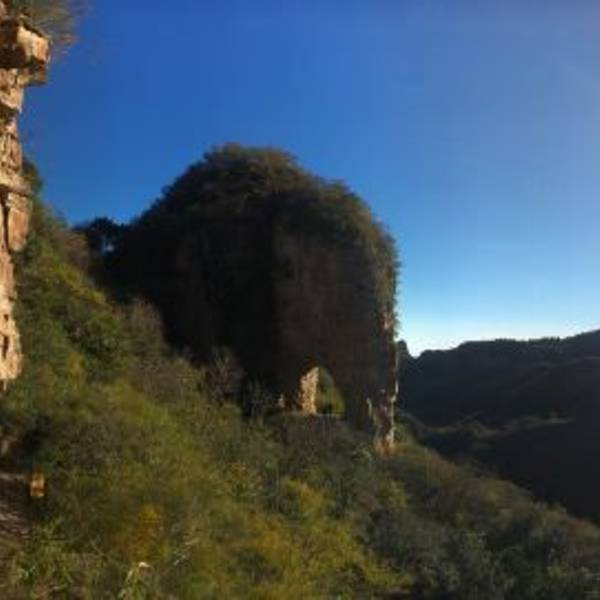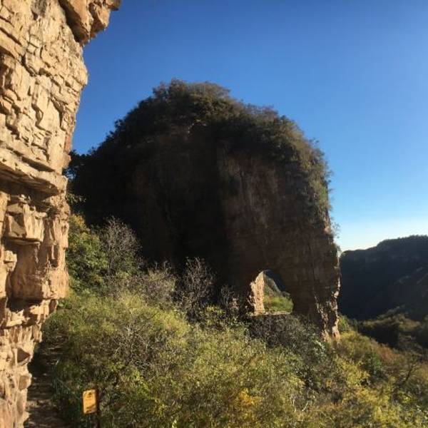 穿过这个“象鼻洞”口,边上还有人工修建的台阶栈道,我们沿神像峰的山体顺着栈道前行,果然转了一圈儿,从“清凉界”的回路,又回到刚才的分叉路。