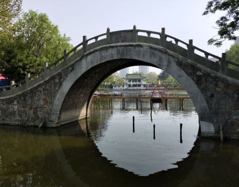 继续向里就能看到一个拱桥,这也是楚秀园最具标志性的景观,沿着雷湖(也就是公园内最大的水体)一路向桥边过去,会经过一个游乐场,这里有吊索飞轮的游乐设施,收费15元一人,没有什么心脏问题的人,可以乘坐,每次5分钟,坐在外侧的话会被甩得稍微高一些,也稍微惊险一些。