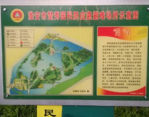 ...间,不然的话,当然会闲庭信步,悠然而坐,公园本来不就应该是让人们感受时间停止,品味鸟语花香的么楚秀园是淮安市比较大的一个公园,想必因为楚州和秀美而得名,去的这天虽然气温不高,但是阳光明媚,风和日丽,还是挺舒服的。 公园门外有停车场,停车5元一次,公园正门宽阔,两旁墙壁似乎是编钟造型,进公园之...楚秀园是淮安市比较大的一个公园,想必因为楚州和秀美而得名,去的这天虽然气温不高,但是阳光明媚,风和日丽,还是挺舒服的。 公园门外有停车场,停车5元一次,公园正门宽阔,两旁墙壁似乎是编钟造型,进公园之后左手有两只孔雀,可以付费与之合影,在景区图上看有十处风景景点,名字很有诗意,个别名称甚至跟杭州西湖景点名称有异曲同工之妙(例如雷湖夕照),但这些景点没有太多标志牌提示,因此只能靠自己意会了。 继续向里就能看到一个拱桥,这也是楚秀园最具标志性的景观,沿着雷湖(也就是公园内最大的水体)一路向桥边过去,会经过一个游乐场,这里有吊索飞轮的游乐设施,收费15元一人,没有什么心脏问题的人,可以乘坐,每次5分钟,坐在外侧的话会被甩得稍微高一些,也稍微惊险一些。 继续向前走就到了拱桥,远处可以眺望宝塔和其他景点,从桥上下来后是老人活动区,其实这里主要就是葱郁的绿树和一些供游人小憩的长椅,坐在这里,伴着微风,沐浴着暖阳,感受岁月静好,这或许不仅是老人的专利,也是任何在每日忙碌节奏之外,想要暂时脱离一下现实,放空思绪,调伏心性的城市上班族的一种享受吧。 老人活动区对面是水上舞台,其实就是立在水中的半圆形的木质舞台,可能在良辰佳节时,这里会有文艺活动或者表演。 继续折回来就又到了大门口,整个公园虽然不小,但是如果一直在行进中的话,也就不到一小时就可以走完,当然自己是因为从外地来到淮安游玩,匆匆行程,之后还要赶往下一个景点,所以才这样的控制时间,不然的话,当然会闲庭信步,悠然而坐,公园本来不就应该是让人们感受时间停止,品味鸟语花香的么。 展开
