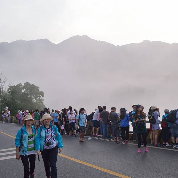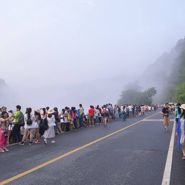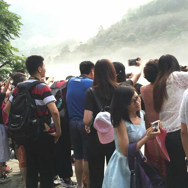买了票,大巴直接送我们进门,沿着湖边公路行驶。旁边的湖面,慢慢吹来一阵阵雾气,大家都惊叹道了仙境!团长告诉我们,因为有昨晚的大雨,今天的雾非常浓!我们听了都无比幸运。