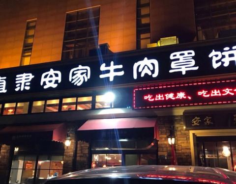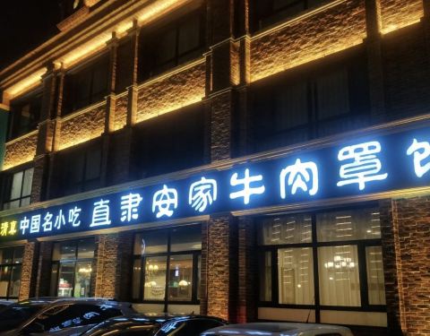 【环境】厅很大,楼上楼下一共两层,门囗停车比较紧张,小胡同两遍马路牙子上,还到处是电线杆子,一定要早来才有车位。保定著名食府,据说已经有300年历史咯,清真店。总店叫是叫牛肉罩饼,但实际以炒菜为主。一进门就是一排冷餐铺开,种类繁多。 【口味】要咯“羊蹄”卤香淡淡的,很有嚼劲。经典名菜“鱼香肉丝”完全不是四川的做法,牛肉丝大葱丝土豆丝一起溜炒,口味先甜后酸有一丝丝微辣。“金毛狮子鱼”松鼠颤鱼的做法,糖醋囗,不过很费刀工,肉全部切丝但不断,油炸蓬松呈狮毛状。“醋溜苜蓿肉”也不错。“煎饼加大葱”配海鸭蛋做子,很香脆。 【服务】工作人员递过来一张菜单,居然是夜宵单!原来安家罩饼晚上做夜宵生意,11点才打烊。