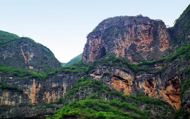 龙门峡最引人注目的就是两岸峭壁上的一排排石孔,它们有序地向远方蜿蜒而去。 这些石孔就是我国最长古栈道的遗迹,它们与奇特的峡谷风光完美融合。