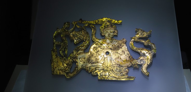 【镇馆之宝1】东汉四灵西王母鎏金柿蒂形饰牌 饰牌鎏金厚度仅为1μm(相当于单根头发的百分之一),镀金工艺非常复杂,技艺这么精巧的东汉饰牌并不多见,可以说是非常珍贵了。