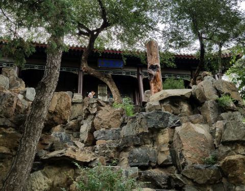 欣赏江苏镇江金山景物,因于山庄内仿造此景,筑亭台楼阁于怪石之间,由山石堆砌,三面临湖,一面溪涧...