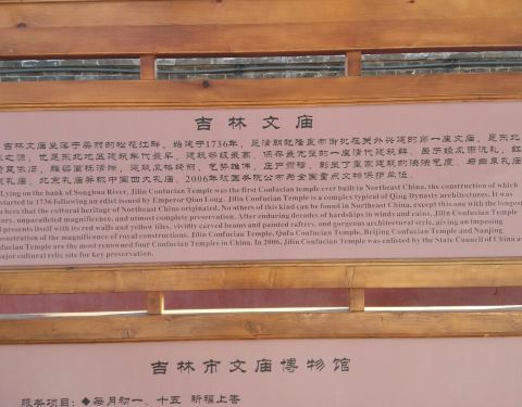 吉林文庙是是东北最大的文庙,与曲阜孔庙、南京孔庙、北京孔庙并称为中国四大文庙。文庙内有孔子生平事迹展览、圣迹石刻图陈列、历代衍圣公及夫人绣像展室、吉林碑林等。