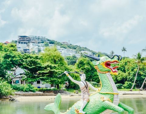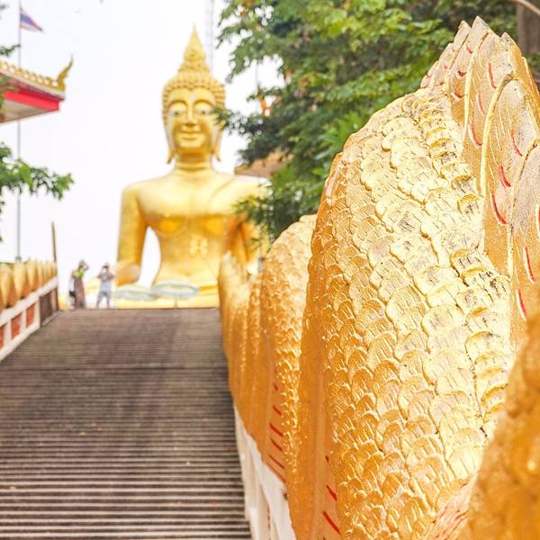 苏梅岛地标景点,金色大佛雄伟壮观,登上山顶眺望四周海域景色。