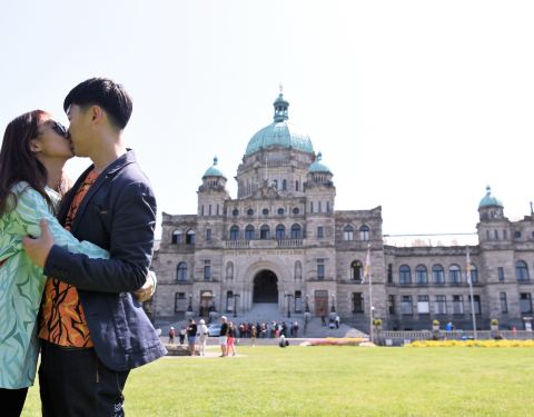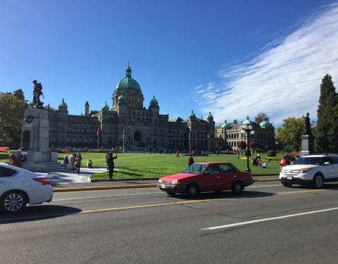 维多利亚省议会大楼1897年落成,是典型的欧式建筑,正对繁忙美丽的维多利亚内港, 门前有漂亮的大草坪,草坪前树立着维多利亚女皇的铜像。