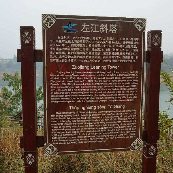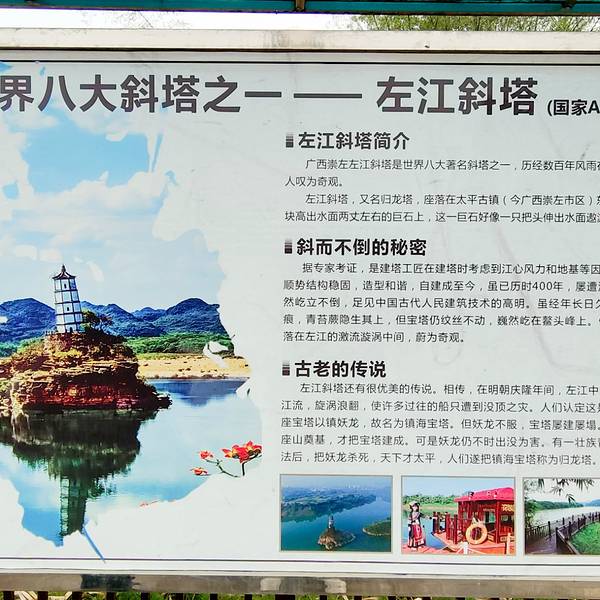 乘坐游船可以更好地欣赏崇左斜塔河左江风光,船票40元,而且,乘坐游船只需要购买游船票,就免景区门票了崇左斜塔,又名归龙塔,位于崇左市区东北郊2公里处,在清幽秀丽的左江中游, 有一叫鳌头山的小岛,崇左斜塔这座古老的斜塔就挺立在小岛上,系左江河畔的一绝。崇左斜塔建于明代于启元年(1621)。分5层,塔底直径...崇左斜塔,又名归龙塔,位于崇左市区东北郊2公里处,在清幽秀丽的左江中游, 有一叫鳌头山的小岛,崇左斜塔这座古老的斜塔就挺立在小岛上,系左江河畔的一绝。崇左斜塔建于明代于启元年(1621)。分5层,塔底直径5米、高28米,塔身呈八面体,塔顶八面飞檐;每层各开一窗口。塔内有螺旋形阶梯通塔顶。整个塔身向外倾斜1米左右,俗称斜塔。1986年第九期《新观察》杂志载文曰:归龙塔为世界八大斜塔之一,与意大利比萨斜塔并列。据专家考证,崇左斜塔是建塔工匠在建塔时考虑到江心风力和地基等因素而精心设计 。