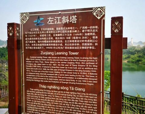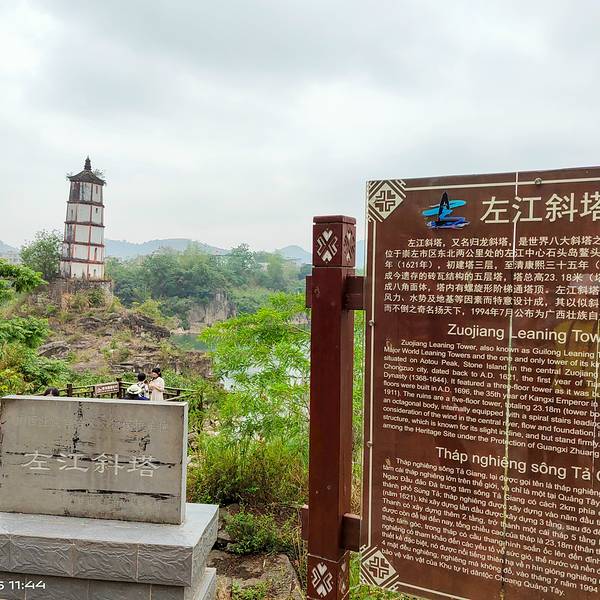看了周围没有船夫,只有一个系着绳子的小塑料筏子,好想飘过去,不过也就是想想,爬到上面景色应该特别好吧相信大部分人都听过 比萨 斜塔吧,因为倾斜的塔身成名,没想 崇左 居然也有个斜塔,景色一点不比 意大利 比萨 斜塔差呢。左江是 崇左 市的一条江,顾名思义,左江上有一座斜塔,它究竟有什么魅力呢。从市区开车大...相信大部分人都听过 比萨 斜塔吧,因为倾斜的塔身成名,没想 崇左 居然也有个斜塔,景色一点不比 意大利 比萨 斜塔差呢。左江是 崇左 市的一条江,顾名思义,左江上有一座斜塔,它究竟有什么魅力呢。从市区开车大概20分钟来到了左江斜塔的景区,还没进入景区远远的就能看到一座斜塔立在远处。院子里的古树就吸引了我,相信也有几百年的历史了。跨过平安门,眼前的景色变得开阔起来,到处都是茂密的树木,在沿江栈道上慢慢的溜达,拍拍美景。树林间的阳光洒下来,真的是好舒服呀。沿着木道走到尽头,此刻与斜塔相隔不过几米的江水,这座塔至今已有400多年的历史了,一直在这座不大的小岛上,不管经历了多少的风雨,还是矗立在这里。斜塔的历史也很有意思,那时候民间纷纷传言这里有恶龙兴风作浪,为此当地知府就在此修建斜塔,神奇的是塔建成后就没有发生过船难了。斜塔在人们心中也形成了一个信仰吧。斜塔近在眼前却不能近观,好可惜,看了周围没有船夫,只有一个系着绳子的小塑料筏子,好想飘过去,不过也就是想想,爬到上面景色应该特别好吧。当地人说,有时候是有人可以渡船过去的呢。这里的林荫小道可真的很舒服,特别阴凉,看着左江的江水吹着凉凉的风,陶醉在这片景色当中。没来这里前还以为只有外国有斜塔,没想到在一个这么小众的地区也能发现与众不同的建筑,果然美景还是需要靠双脚走过才能看到。 展开