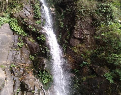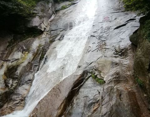 上,宛如一条白龙,从青翠的幽谷中溜出;中间,飞瀑泻在两旁层层凹凸不平的峭壁上,如云如烟,如丝如玉,最后倾泻入深潭,落在一块如距虎的顽石上,轰鸣作雷声、溅起千万碎珠。潭中,浪起汹涌,雨滴落个不停。四周雾气朦胧,细雨绵绵不绝。 可以从明月山索道上站或中站出发,一路下山一路随着瀑布的走向,一个半小时看完全程!