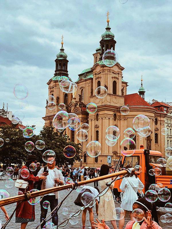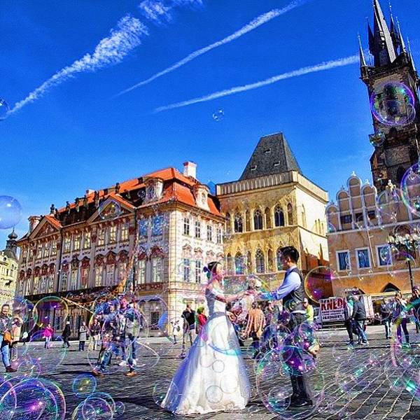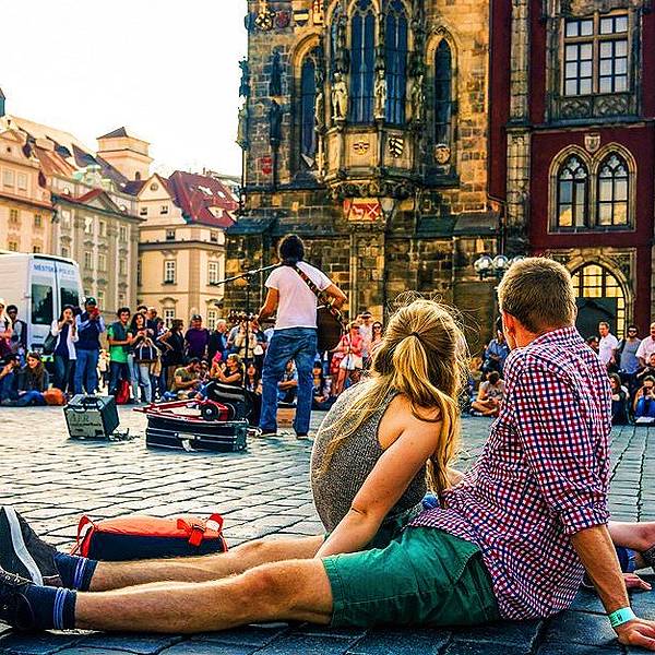铺满青石砖的老城广场上,成群的游客熙熙攘攘,露天的酒吧热热闹闹。随时都能看到皇家观光马车和无忧无虑吹着泡泡的孩子们。无论你走到哪里都能与音乐不期而遇,拉手提琴的街头艺人,穿传统服饰沿街起舞的捷克美女更是随处可见,各种各样的表演完全能满足你爆棚的文艺心。还有很多新婚的恋人们在这里拍婚纱照留念,也难怪,在这浪漫的老城广场上,的确很适合一对对恋人驻足相拥,他们互相依偎在长椅上,随手翻开一本米兰昆德拉的小说,感受彼此的温度和美好,也许这就是爱情最美好的样子。
