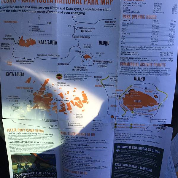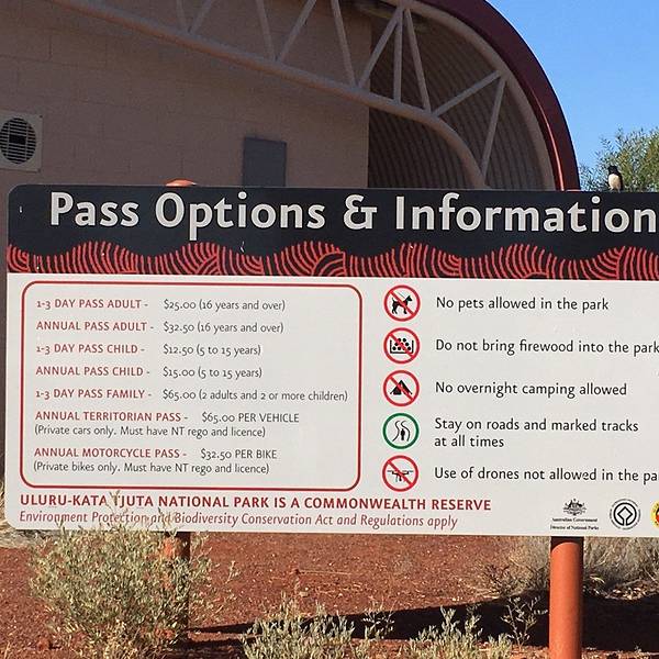 到达公园已经快十一点了,如果是夏季的时候十一点后风之谷入口可能会显示关闭。无奈,竟然满员今天,终于可以去看大石头啦,开了快一周的车,才来到你身边。乌鲁鲁-卡塔丘塔公园,下附一张价格表和一张地图。没得选,最便宜三日票。乌鲁鲁离卡塔丘塔要50km,来回100km。这一天在公园就开了两百多km,也是费...今天,终于可以去看大石头啦,开了快一周的车,才来到你身边。乌鲁鲁-卡塔丘塔公园,下附一张价格表和一张地图。没得选,最便宜三日票。乌鲁鲁离卡塔丘塔要50km,来回100km。这一天在公园就开了两百多km,也是费油。这里油价$2.22在小镇买到了天价的水,10L$15.98。我记得平时都是$4搞定。