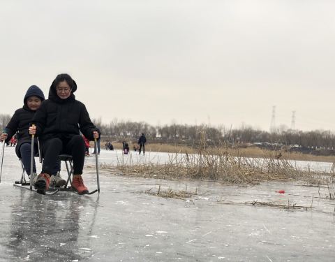 潮白河的冬天真热闹!这么大面积的冰面真是少见。这里是孩子们的乐园。你能想到的各种冰上运动基本都有。特别是在周末,一家人在这里团聚,享受生活。点赞!