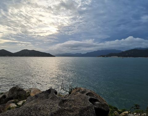 在这边看过去的海边风光,还真的是特别的漂亮,而且的话没有经过很多人工的改造,这边的景色还真的是一绝,人也不是特别的多,在这边的话,静静的等待着太阳落山也是可以的,不过,因为这边并不是正西方,所以看不到完整的太阳下山。