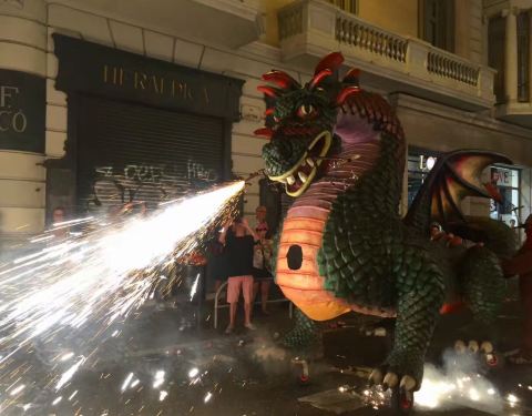 这次真的非常巧刚好遇到每年的9月20号是巴塞罗那的重大节日。圣母梅尔塞节。真的是特别的热闹呀。晚上在这里有最著名的烟花狂奔活动。真的是恶魔出行哦。烟花世界。建议大家一定要注意穿好长袖长裤最好避免穿一些化纤的衣服的,否则烟花爆到衣服上就是一个小洞哦。