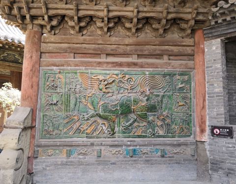 榆次老城城隍庙里有两处影壁墙让人印象深刻。一处是玄鉴楼后戏台两侧的八字琉璃影壁,琉璃壁心上是两只麒麟,阔步回首,神骏非凡。另一处在最后一进院落里,影壁为灰砖砌成,不如琉璃影壁那么显眼,但影壁上的雕龙活灵活现,颇具观赏性。