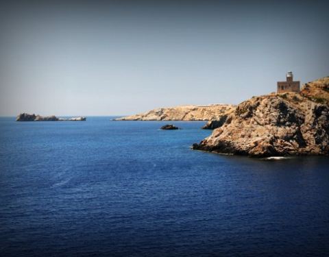 蓝星游轮驶出纳克索斯岛港口大约二小时后,远远地看到竖立于伊奧斯岛海岸峭壁上的灯塔。蓝星游轮于下午14:05分左右抵达另外一个小岛--爱琴海跳岛游最后一个小岛、距离目的地圣托里尼岛最近的小岛伊奧斯岛(IOS...