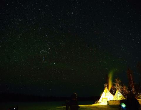 浩瀚夜空中北斗七星特别显眼,这么清晰的凭肉眼就可看到北斗,这也算...- 晚上9点,我们继续去极光村营地。刚到营地,漫天繁星,极光只有若隐若现的一点。大家在营地的帐篷里休息着,时不时出去看看是否有极光出现。