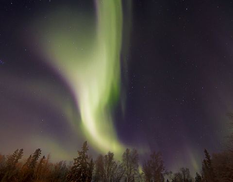 晚上9点,我们继续去极光村营地。刚到营地,漫天繁星,极光只有若隐若现的一点。大家在营地的帐篷里休息着,时不时出去看看是否有极光出现。 浩瀚夜空中北斗七星特别显眼,这么清晰的凭肉眼就可看到北斗,这也算是个意外收获吧。回家整理照片时发觉一张北斗七星与极光的合照,真是难得。12点过后,极光逐渐变大了,一阵一阵的,一会在东一会在西,大家端着相机不停地在营地里换拍摄地点。看过了昨晚的极光,我们显得相对平静些。1点快到了,该离开营地了,我们把照相器材收拾好,走出帐篷。这时候,整个营地里突然像炸锅了一下,都是激动的人声,极光突然爆发了,布满了整个天空!此时的极光才能被称为欧若拉,欧若拉在外面的头顶上翩翩起舞,像蝴蝶、像飞鸟快速的扇动翅膀,像瀑布一样从上往下播撒,瞬息万变,真正是璀璨的天空之舞,根本停不下来的美景盛宴!来不及重新架设相机了,就用眼睛去好好欣赏这视觉上的无从估计的幻变翻腾,享受这若即若离的美感吧。 再见啦,舞动的欧若拉!这一刻的绚烂将是一生的铭记!
