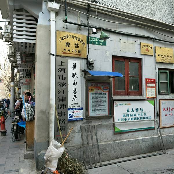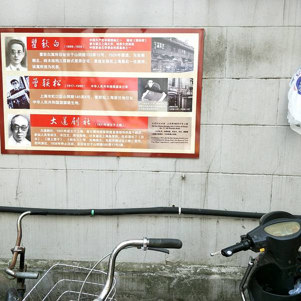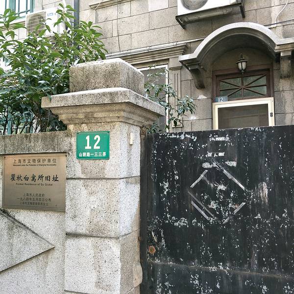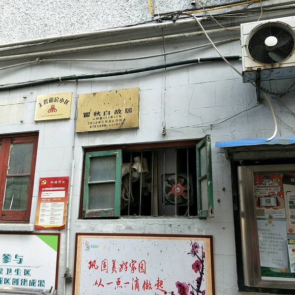 山阴路133弄12号 是石库门建筑大陆新村的对面是山阴路133弄,过去的东照里,又称日照里。这里的12号曾是瞿秋白的故居,但是与十步之遥的大陆新村鲁迅故居形成鲜明对比的是,瞿秋白故居既破败又少人知晓。尽管这里在1984年5月就被定为市级文物保护单位,但不知道是因为里面依然住着居民,还是瞿秋白头上的那片历史功过的乌云尚未散去,门口那块仅一尺见方的金属铭牌,实在简陋得令人惊讶。虽然弄堂口也悬挂了一块约一米长一尺宽的木牌,上面刻着“瞿秋白故居”几个大字,但白底黑字的木牌早已污渍斑斑,走近了细看才发现污渍下的那五个字迹原来是墨绿色的。木牌的上方和左方各有一块某某律师事务所的牌子,右面则是街道设置的金属框玻璃面的宣传栏。在充满现代感的金属和玻璃的簇拥中,“瞿秋白故居”的木牌显得格外寒碜寒酸和寒心。瞿秋白寓所曾联松故居旧址