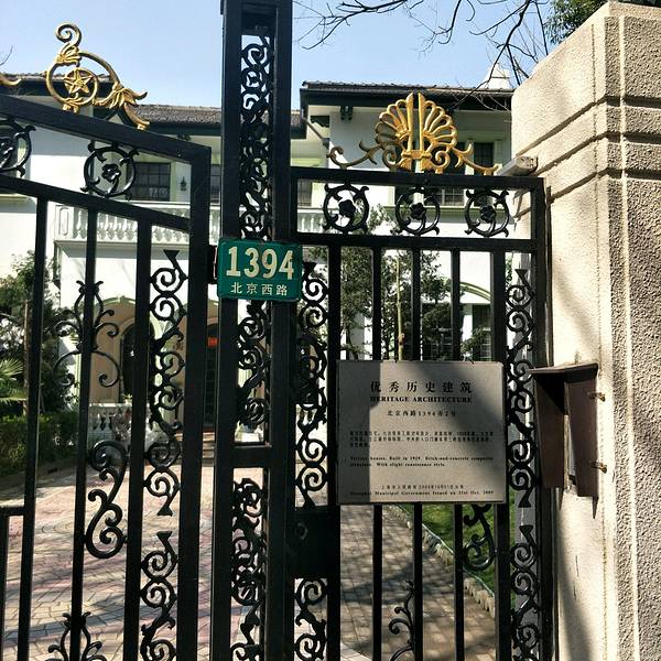 北京西路1394弄北京西路1394号花园住宅东临西康路的北京西路北侧,为一栋独立式的花园别墅,砖混结构二层半,现外立面统一粉刷成白色,轴线对称式布局,总体风格接近于西班牙建筑。上部为红瓦斜坡复折式屋顶,其上可见烟囱。