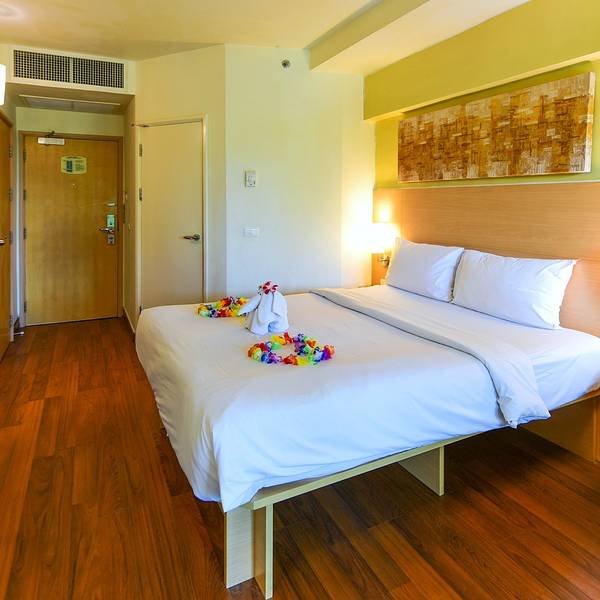 从阳台向外望去,眼前呈现的是一片迷人的海岛泳池风光,当微风轻轻拂面,无比的舒适- 重庆 飞 曼谷 ,飞行时间大概是三个小时,由于第二天要赶早班机去苏梅,就选择了在机场过夜,友情提示要在机场过夜的童鞋们,一定要带一个披肩或者薄外套,因为机场的冷气开的真的很足,毫不夸张的说我连轻薄羽绒...- 重庆 飞 曼谷 ,飞行时间大概是三个小时,由于第二天要赶早班机去苏梅,就选择了在机场过夜,友情提示要在机场过夜的童鞋们,一定要带一个披肩或者薄外套,因为机场的冷气开的真的很足,毫不夸张的说我连轻薄羽绒服都穿上了。另外机场有Sleep Box 胶囊旅馆,大概250泰铢两个小时,我们觉得不划算就直接去了Terminal 2 四楼的 汉堡 王,点了一些吃的就可以坐一晚了,那儿有提供一些皮椅 长沙 发,人少的情况下可以躺下睡觉,服务员不会说什么的。雨后的 曼谷 机场注定让这次的 苏梅岛 之旅开启了一个特别难忘的序幕……第二天早上6:55出发,飞机+车船联运耗费7小时才抵达 苏梅岛 码头,建议不赶时间的小伙伴还是在 曼谷 停留一两天再出发去下一目的地吧,毕竟养好精神,才能玩的更开心。当时在码头预订了亚航接送酒店的服务,人均200泰铢送到目的地还是很划算的。我们选了人少安静的 波普 特海滩,入住了雅高旗下的国际连锁、经济实惠的Hotel Ibis Samui Bophut( 苏梅岛 波普 宜必思酒店) 。这里距离迷人的渔村(Fisherman Village)有短短15分钟步行路程,距离查汶海滩(Chaweng Beach)的其他景点有不到15分钟车程,靠近海滨生活方式购物中心 The Wharf,交通便利,方便出行。酒店的工作人员服务很好,看我们两个女孩子拖着行李立马上前帮忙,指引我们去办理入住,前台的客服mm还会讲一些中文,沟通起来无压力。另外办理手续的时候需要缴纳1000泰铢的押金,如果没有来得及换钱也可以给人民币200元,离店的时候会如数退还。酒店的每一栋都被葱葱郁郁的椰林绿影环抱,遇见蓝天白云的好天气,眼前的景象就像一幅画一样令人沉醉。好喜欢那一束束温柔的阳光洒在草坪上的光影,慵懒的氛围变得柔软而休闲。我们入住的是第四栋楼房,从这个走廊上去就到了客房区域。房间走廊特意预订了一间靠近泳池的海景房,客房面积虽然不大,但配套设施俱全,窗外还带有一个私人阳台,阳台处贴心的绑了一根晾晒衣物的绳子,床上的毛巾也被叠成了一个小象的形状,旁边摆放了两个欢迎的花环,极具 东南亚 特色。室内的整体设计呈暖色调,环境干净卫生,明亮整洁。客房内提供免费WiFi、液晶电视、空调以及带热水淋浴的私人浴室。房费价格在 苏梅岛 来说,性价比很高,值得推荐。对了,酒店提倡环保,一般都不提供牙膏牙刷,记得一定要提前自备额。吹风机、洗发水、沐浴露等备品是有准备的, 泰国 毕竟现在是雨季,万一淋雨了可以立即把头发吹干,避免感冒。衣柜里还贴心的放了一把雨伞和手电筒。床品质量很舒服,隔音效果佳,在这里入住的两个晚上都睡的很安稳。