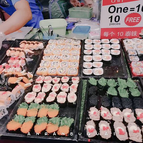 1️⃣寿司🍣,10泰铢一个,在这里吃寿司真的非常日式范了。寿司的种类也是蛮多的,最喜欢鱼籽和海草的。