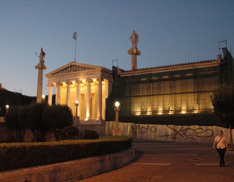 就在路边,包括三座仿古希腊风格的建筑:国家图书馆、雅典大学和雅典学院。全都不让游客进。