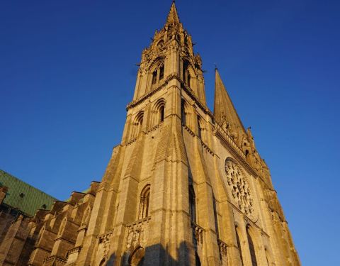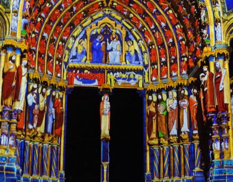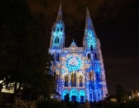 这个教堂最大的特色是每年4月中-10月初,晚上满城各处都有漂亮的灯光秀,尤其以教堂这边的最绚丽。但因为这半年时间欧洲天黑得很晚,22点才天黑,灯光秀开始,所以如果不是自驾的话,最好在这里住一晚上,否则可能错过末班火车。教堂里面的花窗也很胜于其他地方。灯光秀在教堂正面、侧面,和背后的博物馆都有,正面的约10分钟,循环播放。再来沙特尔的路上火车会路过曼特农城堡,可再次下车看看路易十四情妇住的地方。