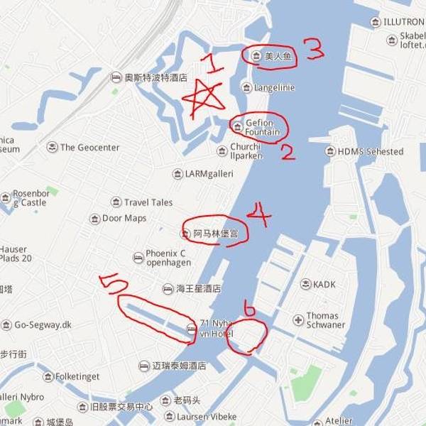 好多景点都在这一区!我把我走了的景点圈出来了, 1:卡斯特雷特城堡,2:吉菲昂喷泉,3:小美人鱼雕塑,4:阿美琳堡宫,5:新港,6:Copenhagen Street Food(哥本哈根小吃岛)。整个卡斯特雷特城堡被一个凸起的五角星型的绿地所包围,站在五角星的步道上,被绿油油的草地,水源和树木环绕,感觉一点也不像在城市中。这里以前是丹麦的军事要塞,现在是长堤公园的一部分,也成了丹麦人最喜爱的慢跑地带。