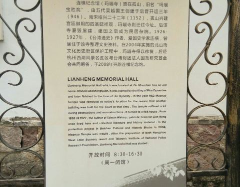 杭州的连横纪念馆,也是玛瑙寺旧址,酒店在附近,来参观下,不要门票的。介绍里写:玛瑙寺原在孤山,旧名玛瑙宝胜院,由五代吴越国王创建于后晋开运三年,南宋绍兴二十二年,孤山兴建宫廷御用的四圣延禅观,一寺...