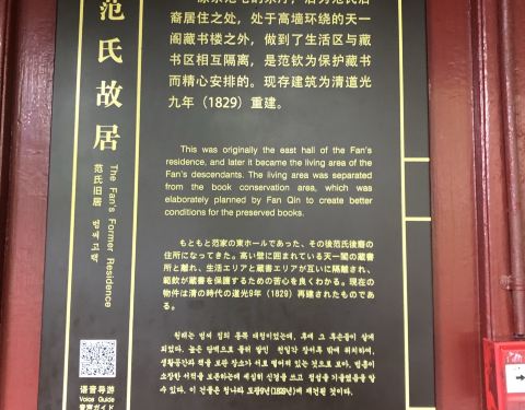 进去天一阁后第一个参观的景点,它位于范氏故居的隔壁进去天一阁后第一个参观的景点,它位于范氏故居的隔壁。根据介绍,这个里是范钦藏书的地方,现在只开放了一搂大厅,可看的东西不多。