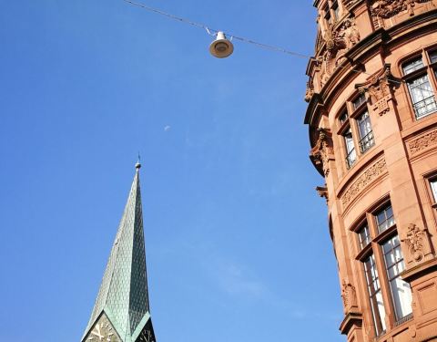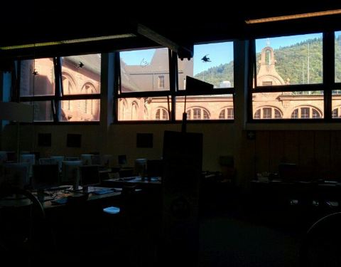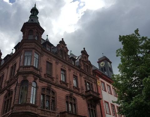 上次到海德堡时间很短,定的小目标就是德国最古老的大学图书馆,拥有6000多册珍贵手稿和古代印刷本、14世纪手本的海德堡大学图书馆。一路上跟着学生模样的很快就找到正门,巍峨的建筑,古典的氛围,衬以碧蓝的天空。里面转了一下,在阅览室门口张望了几眼,据说二楼有个古书展厅,专门收集中世纪手绘图书,展示当时人们书写常用的颜料、金粉、羊皮纸等物品,但现场似乎没发现,不过仅仅是看到建筑的外观就已经让人感觉不虚此行了