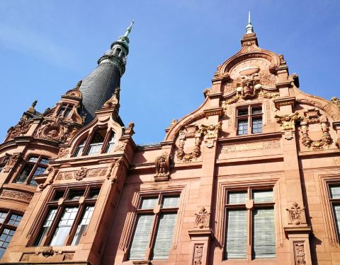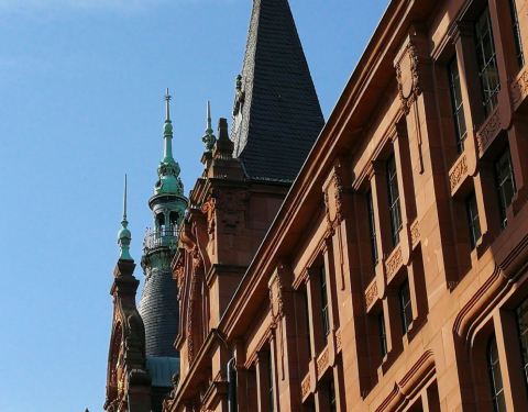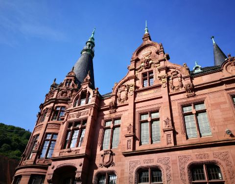 海德堡大学图书馆是一座古色古香的建筑,有着海德堡建筑特有的颜色----红砂岩,图书馆的建筑外观...