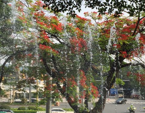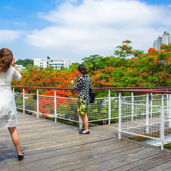 华侨城生态广场自带二楼赏花平台,站在桥上,便是一步一景,正是因为有了这惊艳动人的凤凰花。门票:免费
